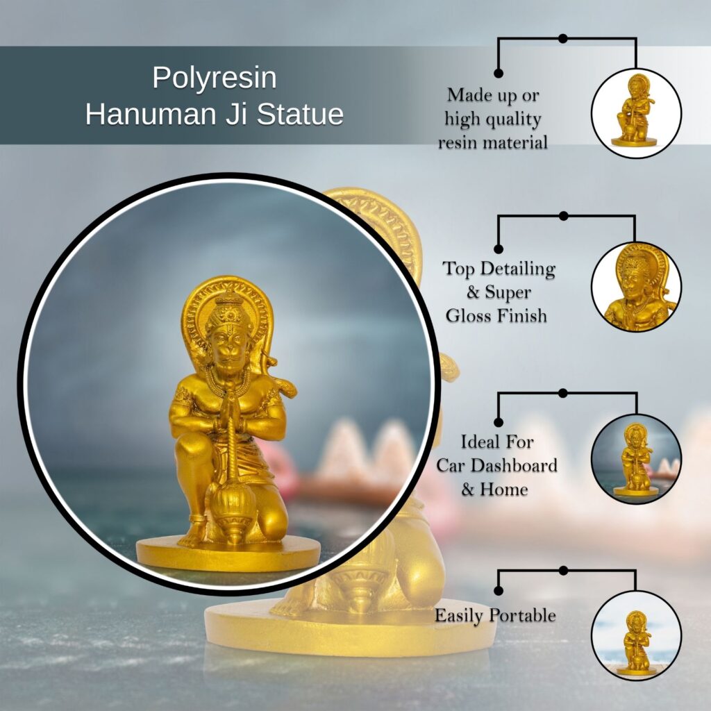Use this HanumanJi statue for pooja, prayer, worship, temple rituals, and religious gifting. This resin murti adds divine strength, spiritual charm, and blessing to your home decor.