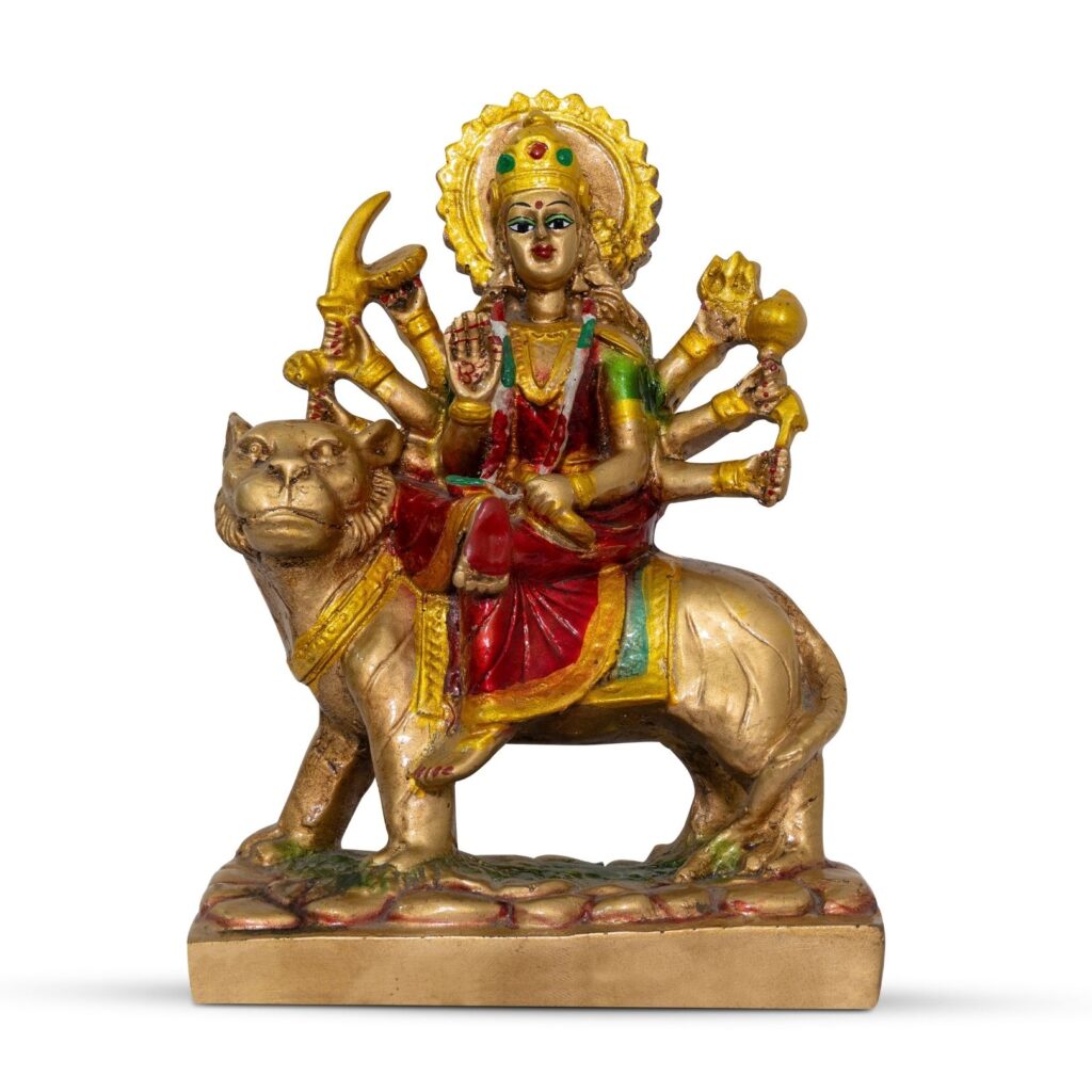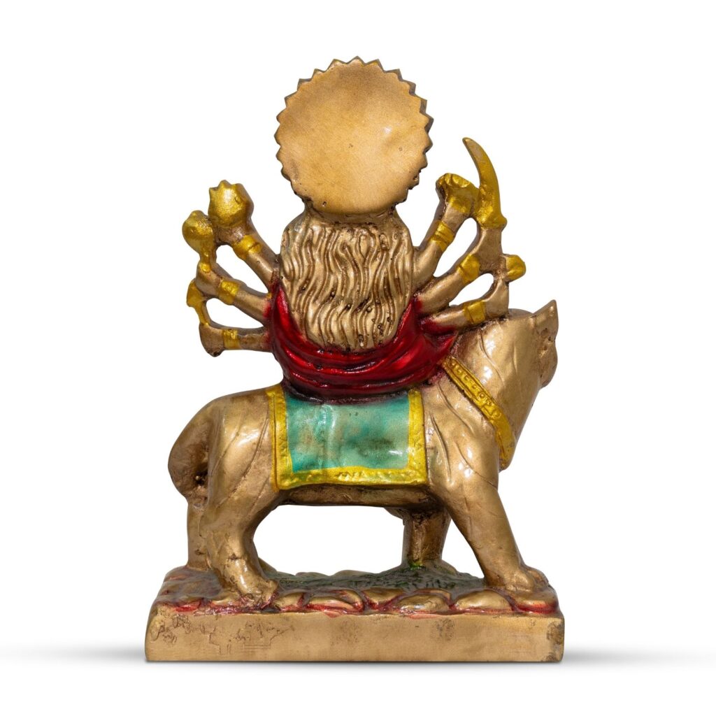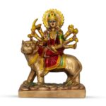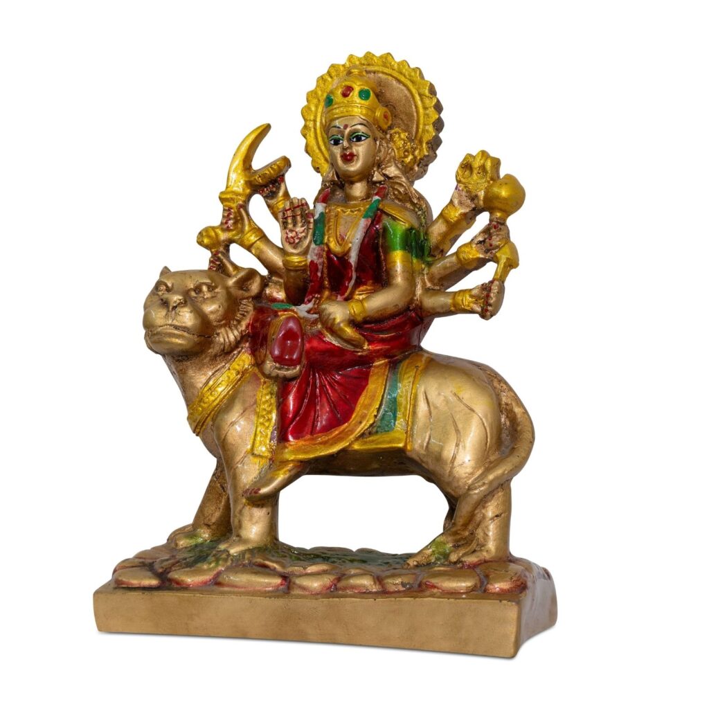 Multicolor Durga Murti for Home Temple Place this multicolor Durga murti in your home temple or pooja room. The goddess statue of Durga Maa on a lion is a symbol of divine strength, protection, and devotion.