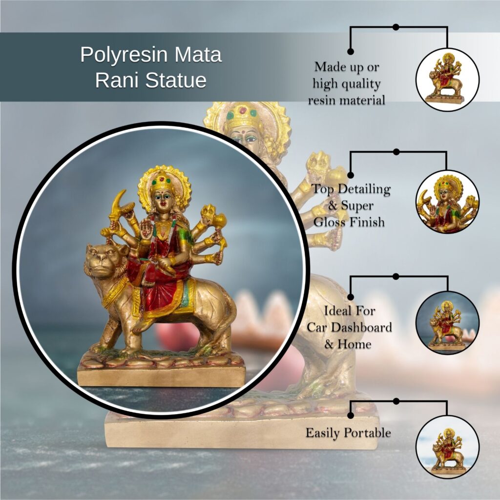 Divine Durga Maa Idol This Durga Maa idol is a powerful goddess statue depicting Durga Maa riding a lion. Crafted in resin, it brings strength, protection, and spiritual blessings to your pooja room.