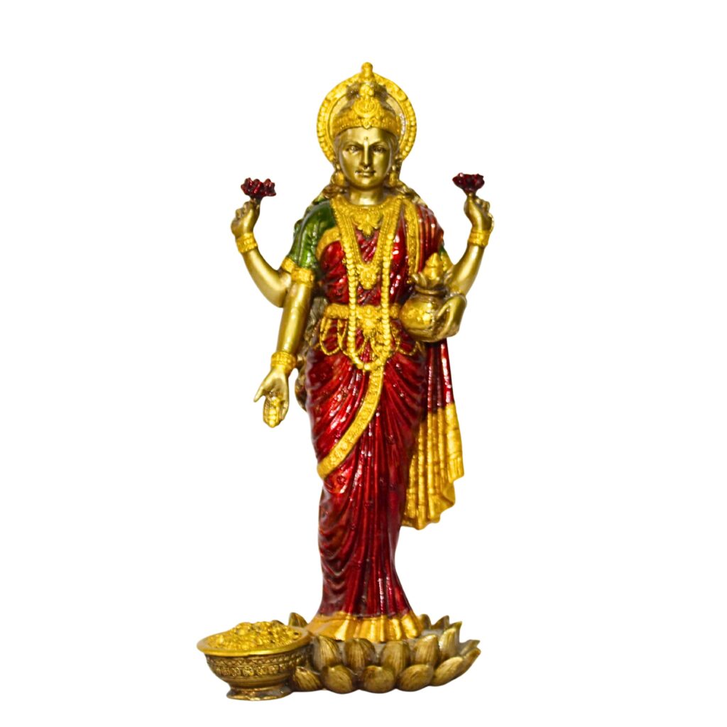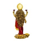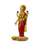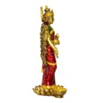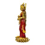 Standing pose on lotus base with traditional attributes including sacred pot and lotus flowers in multiple hands.